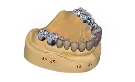 스캔 데이터를 바탕으로 오차를 수정 후 캐드를 이용해 치아를 디자인 합니다. 실제 치아와 흡사한 보철물을 만들기 위해 컬러링과 표면 카운터링 처리를 합니다.
